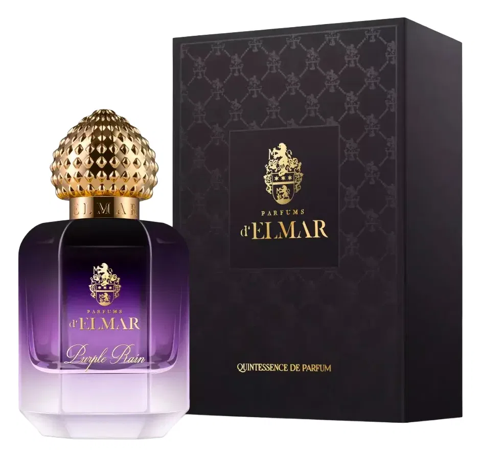 Purple Rain von Parfums d’Elmar wurde der Schönheit eines wärmenden Sommerregens gewidmet – und so präsentiert sich auch der Flacon mit einem Hauch von Natürlichkeit und einem sanften Farbverlauf, der dunkle Wolken und zarten Regen greifbar macht. So wurde der Flacon, der aus schwerem Glas besteht, im oberen Bereich in einem sehr dunklen, geheimnisvollen Violett eingefärbt, das nach unten hin gehend immer zarter und dezenter wird, ehe es in einem sehr hellen Farbton im unteren Bereich des Flacons endet – ähnlich wie der Regen, der aus dem dunklen Himmel auf den Boden fällt. Mit goldener Schrift sticht auf der Vorderseite der Markenname von Parfums d’Elmar hervor, verfeinert durch das luxuriöse Markenlogo. Gleich darunter findet mit eleganter Schrift auch der Name des Duftes – Purple Rain – seinen Platz auf dem Flacon. Durch den goldenen Verschluss, der spitz zuläuft und mit feinen Noppen verziert wurde, wird das Design schließlich vollends abgerundet, sodass ein makelloser und luxuriöser Eindruck entsteht. Verpackt wird der wunderschöne Duft in einer schwarzen Kartonage, auf der mit goldener Schrift ebenfalls alle wichtigen Informationen zum Duft zu finden sind.